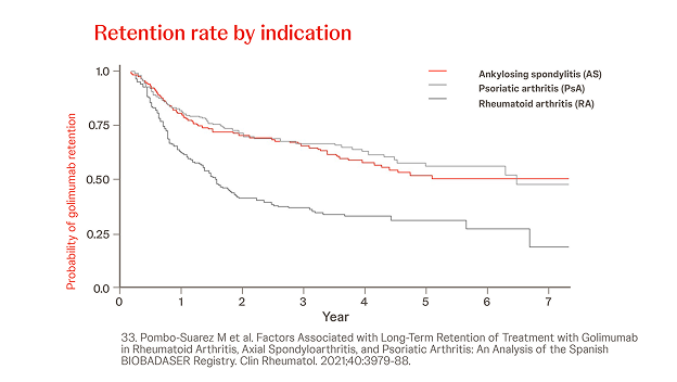 33. Pombo-Suarez M et al. Factors Associated with Long-Term Retention of Treatment with Golimumab in Rheumatoid Arthritis, Axial Spondyloarthritis, and Psoriatic Arthritis: An Analysis of the Spanish BIOBADASER Registry. Clin Rheumatol. 2021;40:3979-88.